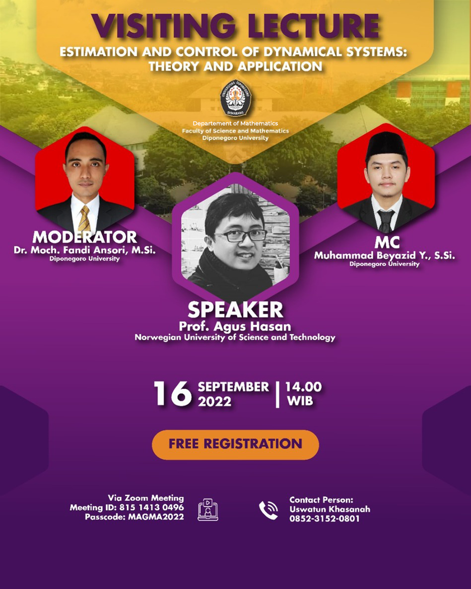 Department of Mathematics at the Faculty of Sciences and Mathematics, Diponegoro University, is organizing a visiting lecture on “Estimation and Control of Dynamical Systems: Theory and Application” to be held on Friday, 16 September 2022, at 14:00 WIB. The lecture will be conducted online via Zoom, and participants can join using the provided Zoom Meeting link, Meeting ID: 815 1413 0496, and Passcode: MAGMA2022.