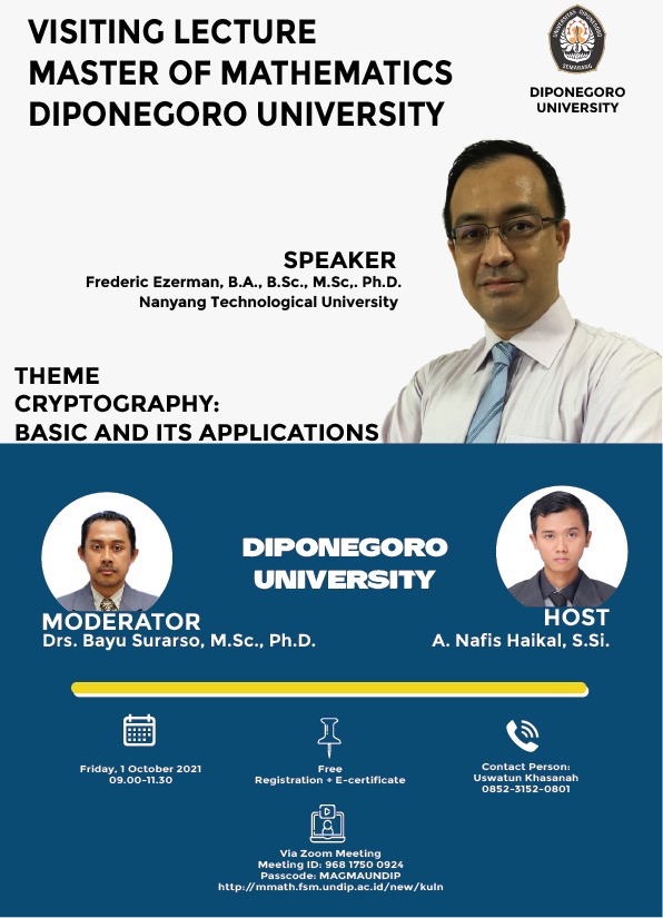 The Mathematics Department of the University of Diponegoro is thrilled to provide this valuable learning opportunity to its students and the wider academic community. This visiting lecture promises to be an intellectually stimulating experience for all those interested in cryptography, mathematics, and the ever-evolving world of digital security.
