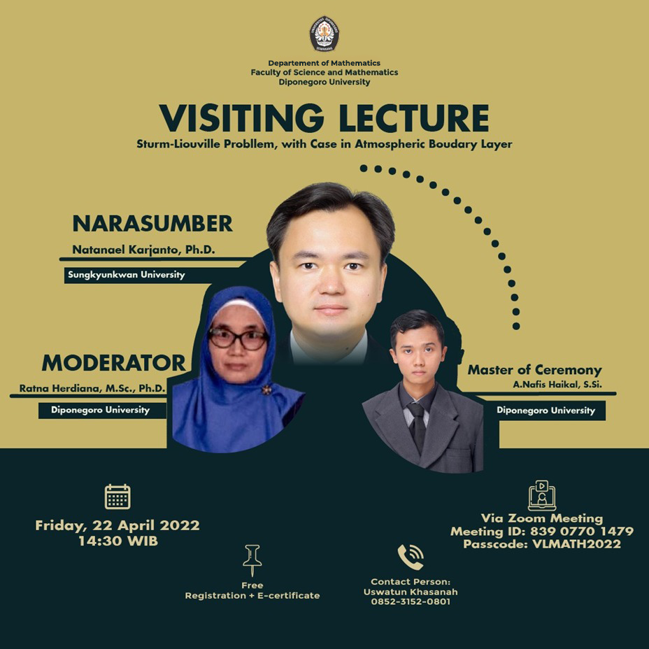 Department of Mathematics at the Faculty of Sciences and Mathematics, Diponegoro University, is organizing a visiting lecture on “Sturm-Liouville Problem, with Case in Atmospheric Boundary Layer” to be held on Friday, 22 April 2022, at 14.30 WIB. The lecture will take place online via Zoom, and participants can join using the provided Zoom Meeting link, Meeting ID: 839 0770 1479, and Passcode: VLMATH2022.