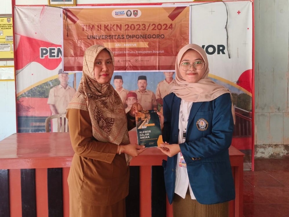 Boyolali (30/7). Mahasiswa KKN Tim II Universitas Diponegoro 2023/2024, dalam pengabdiannya di Desa Klewor, Kecamatan Kemusu, Kabupaten Boyolali meluncurkan program inovatif Buku “Klewor dalam Angka” yang bertujuan untuk menyajikan data statistik kehidupan di Desa Klewor dengan cara yang menarik dan mudah dipahami. Buku ini dibuat sebagai bentuk program kerja monodisiplin dari Namia Fimieta, mahasiswa Program Studi S1 Matematika, Fakultas Sains dan Matematika.